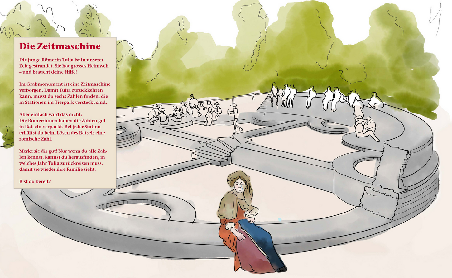 Die junge Römerin Tulia ist in unserer Zeit gestrandet. Sie hat grosses Heimweh – und braucht deine Hilfe! Im Grabmonument ist eine Zeitmaschine verborgen. Damit Tulia zurückkehren kann, müssen sechs Zahlen gefunden werden, die in Stationen im Tierpark versteckt sind. Aber einfach wird das nicht: Die Römer*innen haben die Zahlen gut in Rätseln verpackt. Bei jeder Station erhalten die Besucher*innen beim Lösen des Rätsels eine römische Zahl. Nur wer alle Zahlen kennt, kann herausfinden, in welches Jahr Tulia zurückreisen muss, damit sie wieder ihre Familie sieht.