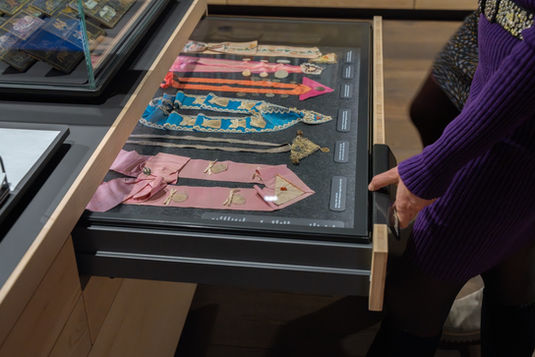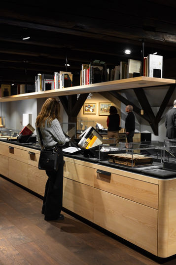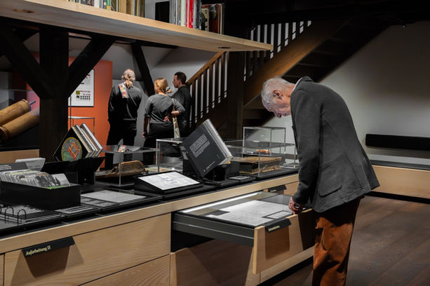 Rund 80 Archivschubladen eröffnen eine zusätzliche Ebene der Vertiefung und zeigen Miniaturen aus dem Museumsbestand, die Besucher:innen thematisch durch die Ausstellung führen. Das eigens entwickelte modulare Mobiliar bildet die räumliche Grundlage der Ausstellung. Es lässt sich flexibel umbauen und an wechselnde Objekte und Szenenfolgen anpassen. Gleichzeitig dient es als integrierter Stauraum für sämtliche Archivobjekte, wodurch Funktionalität und Gestaltung nahtlos ineinandergreifen.